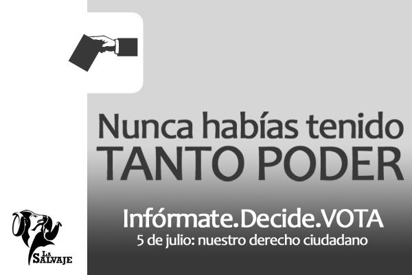 El Grupo Estudiantil de Animación "La Salvaje" como parte del compromiso ético y ciudadano por el cual se rige, te invita a ejercer uno de tus mayores derechos: EL VOTO. Este 5 de julio todos los mexicanos tendremos la oportunidad de ejercer nuestro poder, el poder ciudadano de elegir a quienes serán nuestros representantes políticos. Es nuestro deber y derecho el asistir a las urnas, expresar nuestra opinión y votar libremente por la opción que más nos agrade. Te invitamos a unirte a este objetivo: vencer el abstencionismo y trabajar por una democracia más justa y participativa.